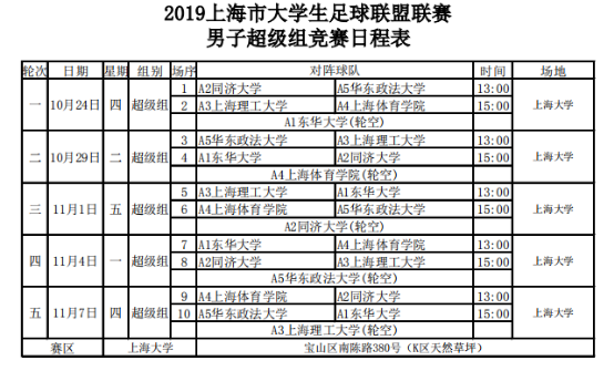 2019年上海市大学生足球联盟联赛男子超级组比赛于10月24在上海大学打响。本次比赛共有五支球队参赛,分别是久久网
